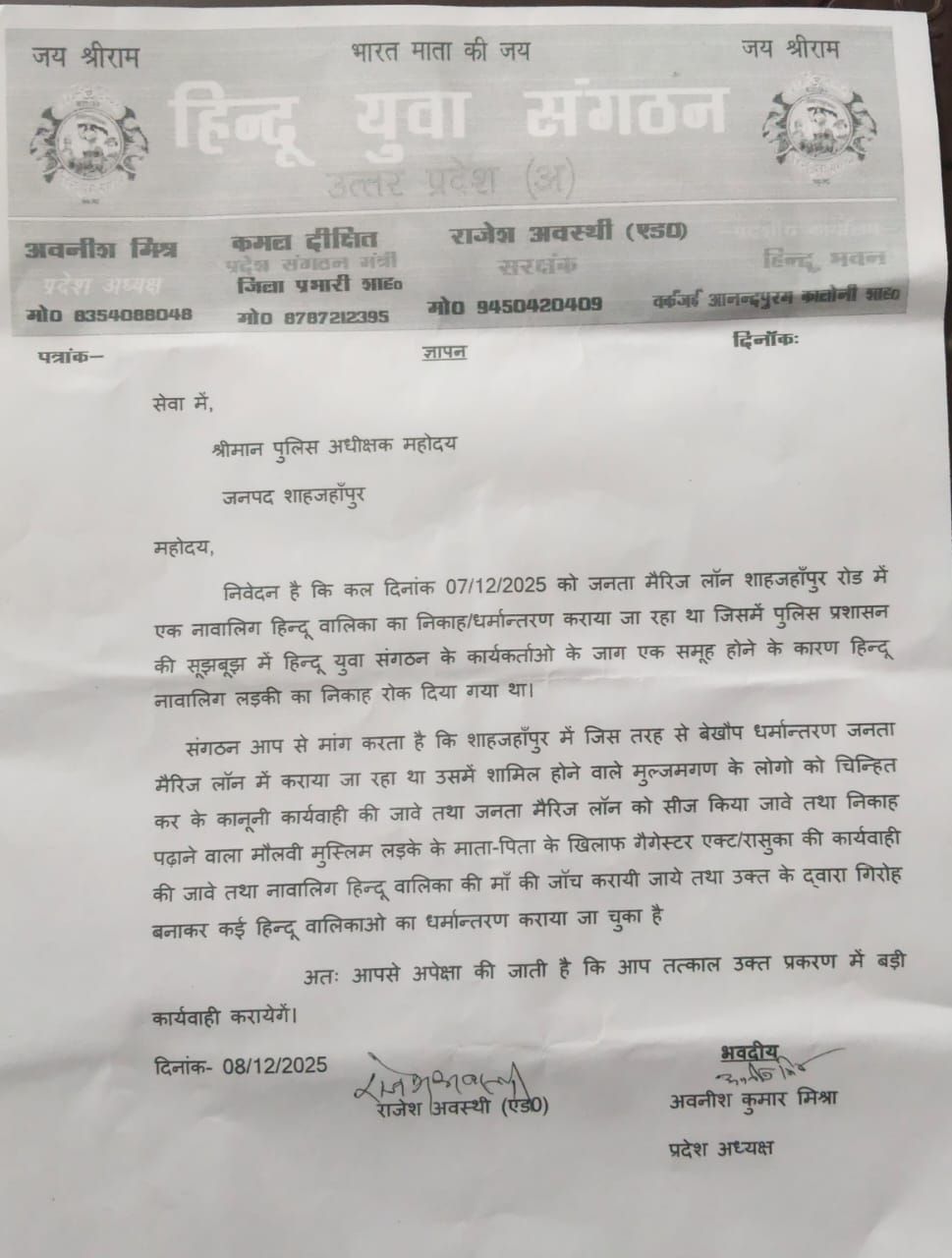 शाहजहांपुर। जिले में एक हिंदू नाबालिग किशोरी का जबरन धर्मांतरण कराकर गैर समुदाय के युवक से निकाह कराए जाने के मामले ने गंभीर तूल पकड़ लिया है। मामले के खुलासा होने के बाद हिंदू युवा संगठन उत्तर प्रदेश (अ) के पदाधिकारी और कार्यकर्ता सोमवार को पुलिस अधीक्षक राजेश द्विवेदी से मिले और कठोर कार्रवाई की मांग को लेकर विस्तृत ज्ञापन सौंपा। संगठन ने इस घटना को न सिर्फ सामाजिक ताने-बाने पर हमला बताया, बल्कि कानून व्यवस्था के लिए खतरा बताते हुए इसे “पूर्व नियोजित षड्यंत्र” करार दिया।
