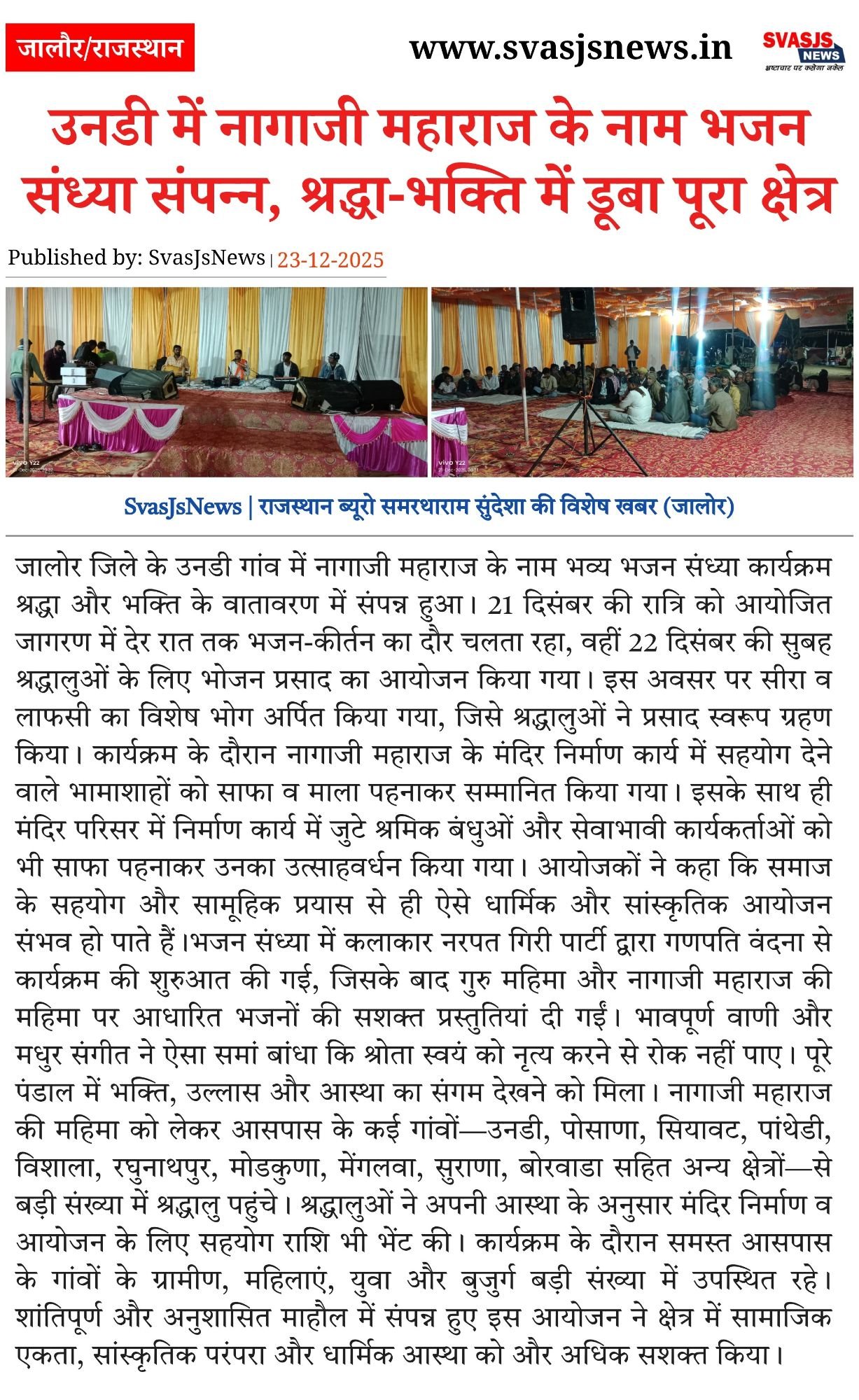 जालोर जिले के उनडी गांव में नागाजी महाराज के नाम भव्य भजन संध्या कार्यक्रम श्रद्धा और भक्ति के वातावरण में संपन्न हुआ। 21 दिसंबर की रात्रि को आयोजित जागरण में देर रात तक भजन-कीर्तन का दौर चलता रहा, वहीं 22 दिसंबर की सुबह श्रद्धालुओं के लिए भोजन प्रसाद का आयोजन किया गया। इस अवसर पर सीरा व लाफसी का विशेष भोग अर्पित किया गया, जिसे श्रद्धालुओं ने प्रसाद स्वरूप ग्रहण किया।