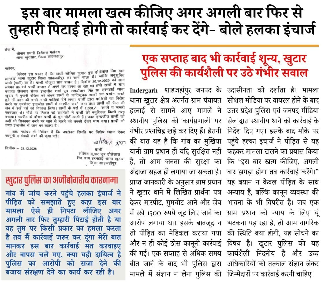 प्राप्त जानकारी के अनुसार ग्राम प्रधान ने खुटार थाने में लिखित प्रार्थना पत्र देकर मारपीट, गुमचोट आने और जेब में रखे 1500 रुपये लूट लिए जाने का आरोप लगाया था। इसके बावजूद न तो पीड़ित का मेडिकल कराया गया और न ही कोई ठोस कानूनी कार्रवाई की गई। एक सप्ताह से अधिक समय बीत जाने के बाद भी पुलिस द्वारा मामले में संज्ञान न लेना पुलिस की उदासीनता को दर्शाता है।