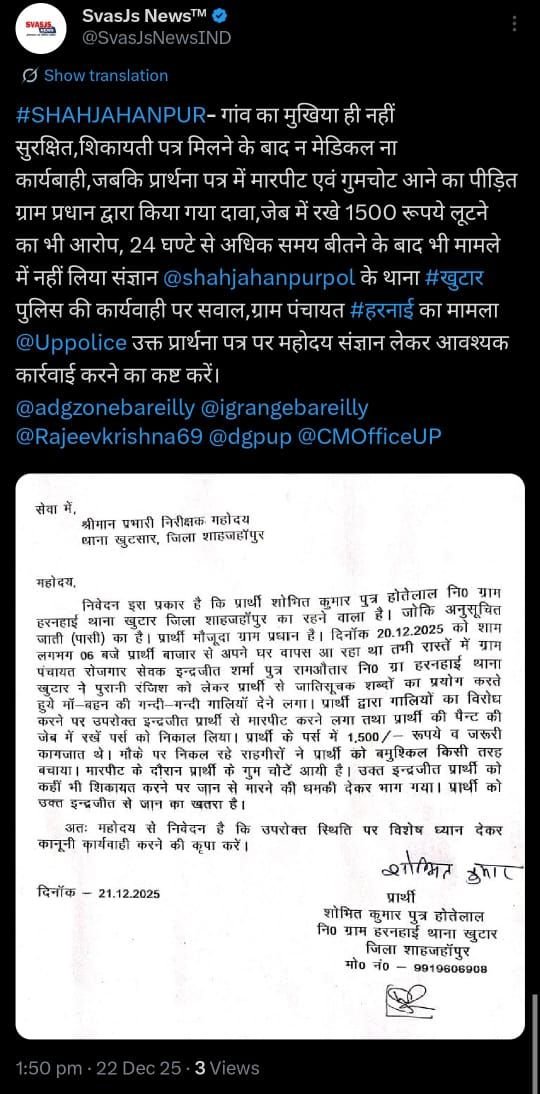 शाहजहांपुर जनपद के थाना खुटार क्षेत्र अंतर्गत ग्राम पंचायत हरनाई से सामने आए मामले ने स्थानीय पुलिस की कार्यप्रणाली पर गंभीर प्रश्नचिह्न खड़े कर दिए हैं। हैरानी की बात यह है कि गांव का मुखिया यानी ग्राम प्रधान ही यदि सुरक्षित नहीं है, तो आम जनता की सुरक्षा का अंदाजा सहज ही लगाया जा सकता है।