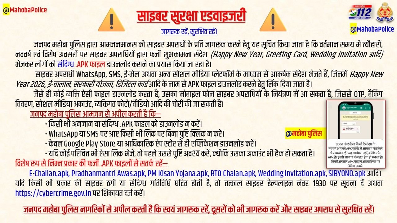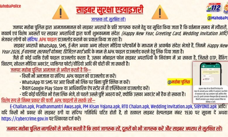 महोबा। नववर्ष, त्योहारों और विशेष आयोजनों के दौरान साइबर अपराधियों की सक्रियता तेजी से बढ़ जाती है। इसी को देखते हुए जनपद महोबा पुलिस ने नागरिकों से विशेष सतर्कता बरतने की अपील की है। पुलिस का कहना है कि साइबर ठग इन दिनों Happy New Year, Greeting Card, Wedding Invitation, E-Challan जैसे आकर्षक नामों से फर्जी लिंक और .APK फाइलें भेजकर लोगों को ठगी का शिकार बना रहे हैं।