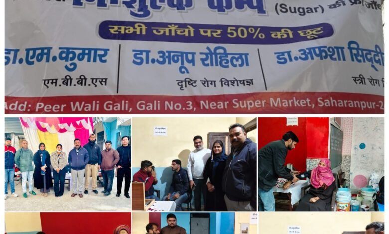 सहारनपुर स्थानीय मोहल्ला आली स्थित गुलशन पब्लिक स्कूल में आज एक विशाल स्वास्थ्य जांच शिविर (Health Camp) का सफल आयोजन किया गया। इस शिविर का मुख्य उद्देश्य क्षेत्र के नागरिकों को कम खर्च में विशेषज्ञ चिकित्सा परामर्श और जांच सुविधाएं उपलब्ध कराना रहा। शिविर में स्वास्थ्य जगत के विभिन्न विशेषज्ञों ने अपनी सेवाएं दीं। मुख्य रूप से फिजिशियन डॉक्टर एम. कुमार ने सामान्य बीमारियों की जांच की, जबकि नेत्र रोग विशेषज्ञ डॉक्टर अनूप रोहिल्ला ने मरीजों की आंखों की गहनता से जांच की। महिला रोगों से संबंधित परामर्श के लिए डॉक्टर अफशा सिद्दीकी मौजूद रहीं, जिन्होंने महिलाओं को स्वास्थ्य के प्रति जागरूक किया।