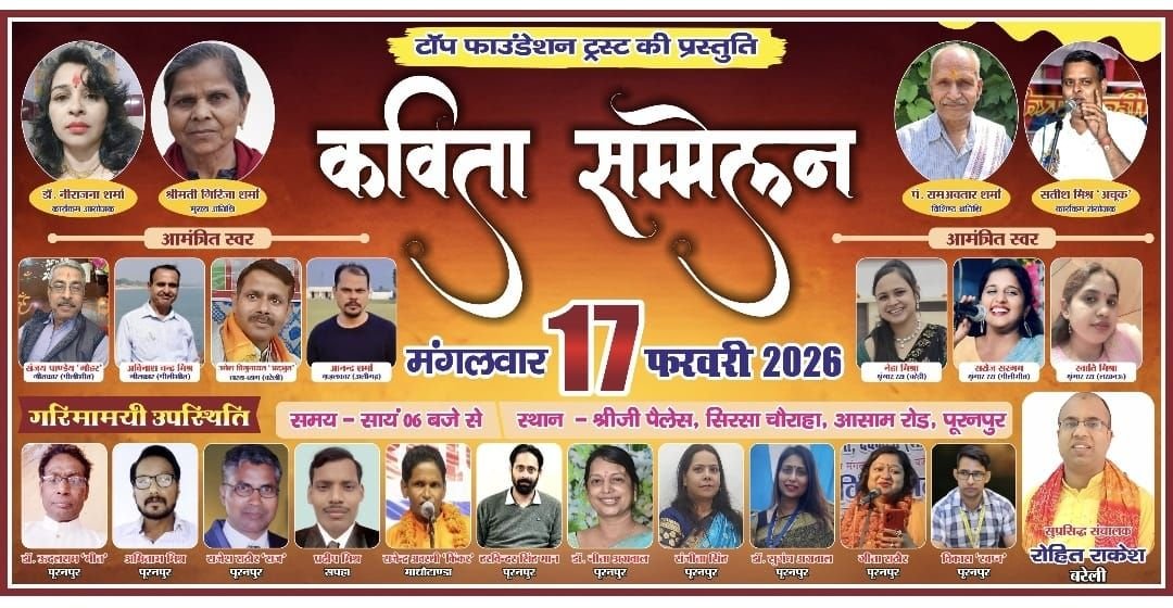 पूरनपुर में साहित्य प्रेमियों के लिए शाम खास होने जा रही है। टॉप फाउंडेशन ट्रस्ट के तत्वावधान में 17 फरवरी को आसाम रोड, सिरसा चौराहा स्थित श्री जी पैलेस में भव्य कविता सम्मेलन का आयोजन किया जा रहा है। यह आयोजन क्षेत्र में साहित्यिक चेतना को नई ऊर्जा देने का प्रयास माना जा रहा है।