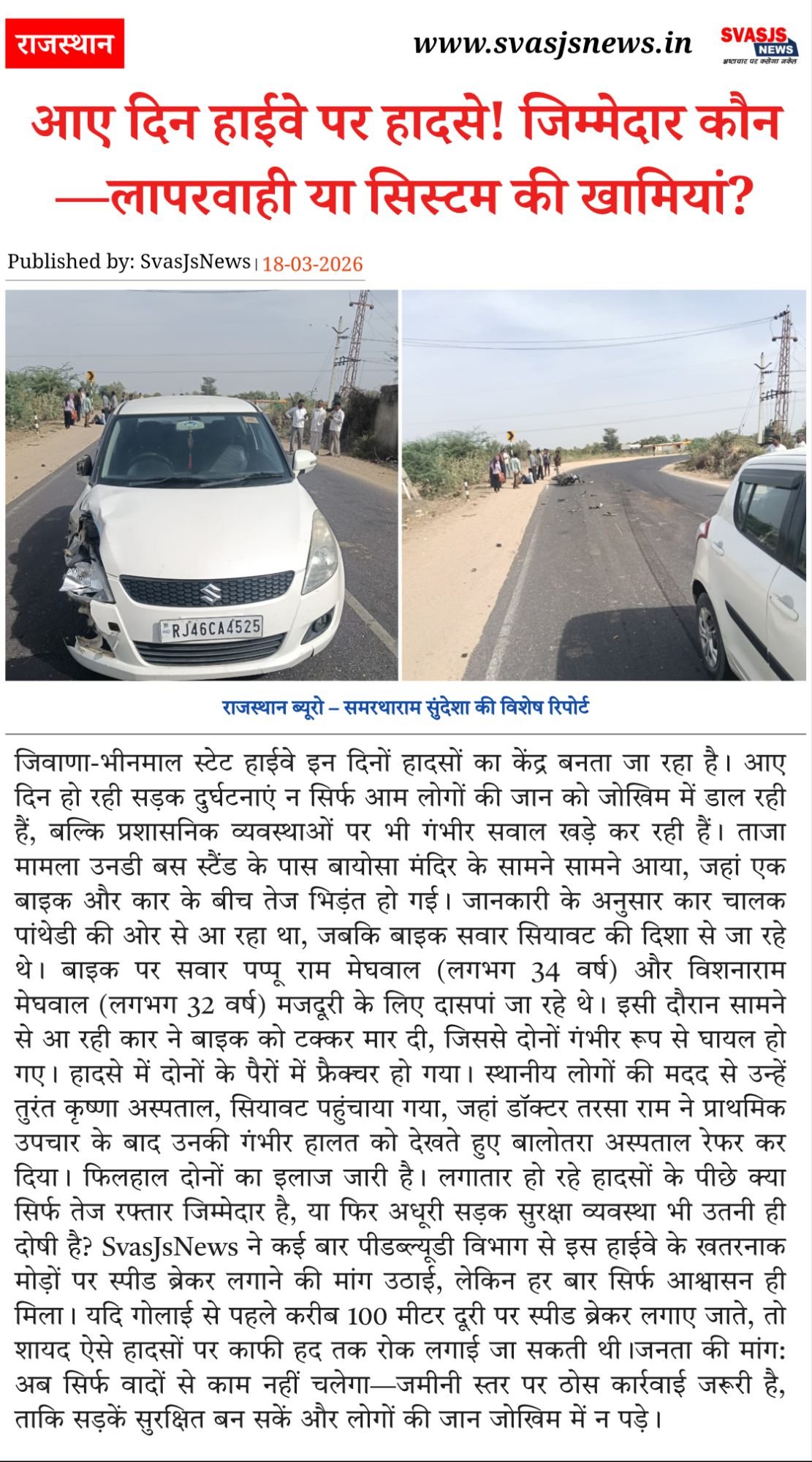 लगातार हो रहे इन हादसों के पीछे क्या केवल तेज रफ्तार ही जिम्मेदार है, या फिर सड़क सुरक्षा से जुड़ी अधूरी व्यवस्थाएं भी उतनी ही दोषी हैं? SvasJsNews लगातार इस मुद्दे को उठाता रहा है। कई बार पीडब्ल्यूडी विभाग से खतरनाक मोड़ों पर स्पीड ब्रेकर लगाने और चेतावनी संकेत लगाने की मांग की गई, लेकिन हर बार सिर्फ आश्वासन ही मिला।