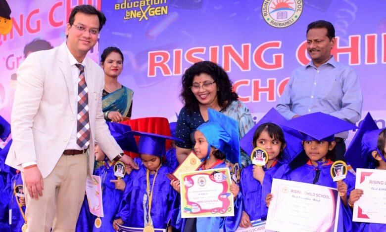 राइजिंग चाइल्ड स्कूल में ग्रेजुएशन समारोह आयोजित, गाउन में सजे बच्चों को किया गया सम्मानित