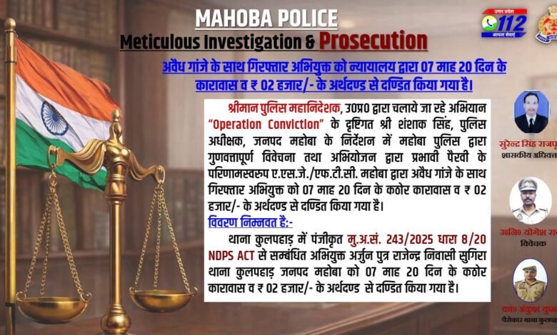 महोबा। जनपद महोबा में कानून व्यवस्था को सुदृढ़ करने और अपराधियों के विरुद्ध प्रभावी कार्रवाई सुनिश्चित करने के उद्देश्य से चलाए जा रहे ऑपरेशन कन्विक्शन के अंतर्गत पुलिस को एक महत्वपूर्ण सफलता प्राप्त हुई है। अवैध मादक पदार्थों की तस्करी के मामले में गिरफ्तार अभियुक्त को न्यायालय द्वारा दोषी ठहराते हुए सजा सुनाई गई है, जो जिले में अपराध के खिलाफ कड़ी कार्रवाई का स्पष्ट संदेश देता है। प्राप्त जानकारी के अनुसार, पुलिस द्वारा पूर्व में एक अभियुक्त को अवैध गांजे के साथ गिरफ्तार किया गया था। इस मामले में साक्ष्यों और विवेचना के आधार पर प्रभावी पैरवी की गई, जिसके परिणामस्वरूप न्यायालय ने अभियुक्त को दोषी करार देते हुए 07 माह 20 दिन के कठोर कारावास की सजा सुनाई। इसके साथ ही न्यायालय ने अभियुक्त पर ₹2000 का अर्थदंड भी लगाया है।