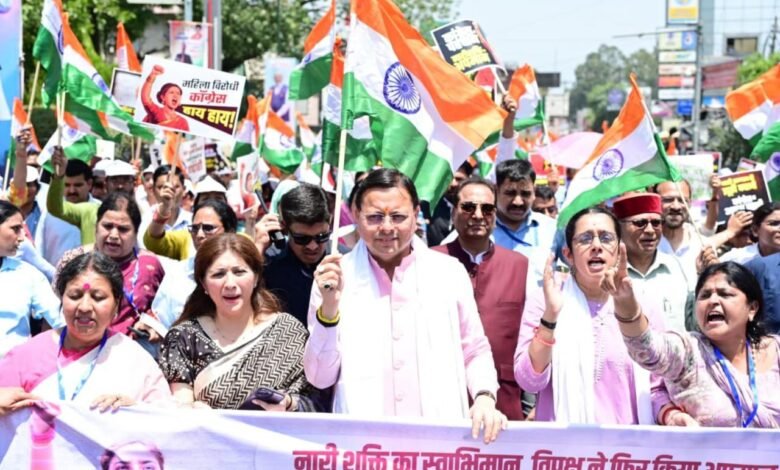 देहरादून मुख्यमंत्री पुष्कर सिंह धामी ने शुक्रवार को परेड ग्राउण्ड, देहरादून में महिला जन आक्रोश रैली में प्रतिभाग किया। इस दौरान मुख्यमंत्री, हजारों की संख्या में मौजूद महिलाओं के साथ परेड ग्राउंड से घंटाघर तक जन आक्रोश पदयात्रा में भी शामिल हुए। मुख्यमंत्री धामी ने कहा कि प्रधानमंत्री नरेंद्र मोदी के नेतृत्व में मातृशक्ति को देश की लोकतांत्रिक व्यवस्था में उनका अधिकार दिलाने के लिए नारी शक्ति वंदन अधिनियम लाया गया था। परंतु लोकसभा में संख्या बल के कारण बिल पारित नहीं हो पाया। उन्होंने कहा विपक्ष ने षड्यंत्र करके नारी शक्ति का अधिकार छिनने का काम किया है। उन्होंने कहा देश की नारी, अन्याय के विरुद्ध अवश्य आवाज उठाएगी क्योंकि अब नारी अपने अधिकारों के प्रति सजग हो चुकी है। मुख्यमंत्री ने कहा राज्य सरकार भी मातृशक्ति के कल्याण के लिए समर्पित होकर कार्य कर रही है। राज्य में महिलाओं के कल्याण एवं सशक्तिकरण के लिए सरकारी सेवाओं में 30 प्रतिशत आरक्षण लागू किया गया है। महिलाओं की सुरक्षा और उनके अधिकारों की रक्षा हेतु राज्य में समान नागरिक संहिता को लागू किया गया है। इस अवसर पर राज्यसभा सांसद महेंद्र भट्ट, सांसद माला राज्यलक्ष्मी शाह, विधायक सविता कपूर, आशा नौटियाल, रेनू बिष्ट, रुचि भट्ट, दीप्ति रावत, नेहा जोशी, हिमानी, रश्मि रस्तोगी एवं बड़ी संख्या में मातृशक्ति मौजूद थी।