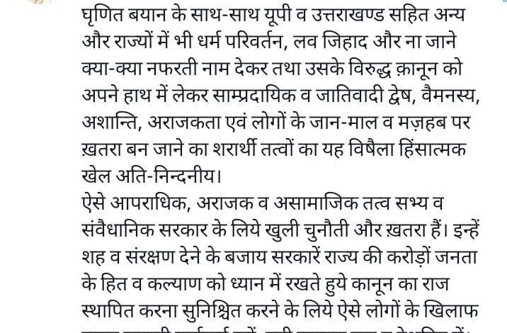 *’मुस्लिम लड़की लाओ, नौकरी पाओ, के ताज़ा संकीर्ण व घृणित बयान के साथ-साथ यूपी व उत्तराखण्ड सहित अन्य और राज्यों में भी धर्म परिवर्तन, लव जिहाद और ना जाने क्या-क्या नफरती नाम देकर तथा उसके विरुद्ध क़ानून को अपने हाथ में लेकर साम्प्रदायिक व जातिवादी द्वेष, वैमनस्य, अशान्ति, अराजकता एवं लोगों के जान-माल व मज़हब पर ख़तरा बन जाने का शरार्थी तत्वों का यह विषैला हिंसात्मक खेल अति-निन्दनीय। ऐसे आपराधिक, अराजक व असामाजिक तत्व सभ्य व संवैधानिक सरकार के लिये खुली चुनौती और ख़तरा हैं। इन्हें शह व संरक्षण देने के बजाय सरकारें राज्य की करोड़ों जनता के हित व कल्याण को ध्यान में रखते हुये कानून का राज स्थापित करना सुनिश्चित करने के लिये ऐसे लोगों के खिलाफ सख़्त कानूनी कार्रवाई करें, यही व्यापक जन व देशहित में सही होगा।