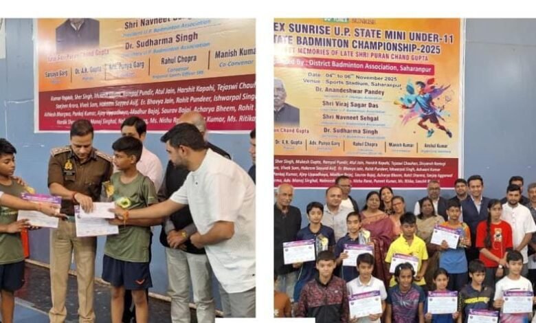 सहारनपुर डॉ. भीमराव अंबेडकर स्टेडियम में अंडर-11 वर्ग की बैडमिंटन प्रतियोगिता के फाइनल मुकाबले रोमांचक अंदाज में सम्पन्न हुए। खिलाड़ियों ने शानदार प्रदर्शन से दर्शकों का दिल जीत लिया। गर्ल्स सिंगल्स में सांवि कुमार (लखनऊ) ने मेघा सिंह (अलीगढ़) को कड़े मुकाबले में हराया, जबकि बॉयज सिंगल्स में श्रेष्ठ कुमार (आगरा) ने ओनिस खंडेलवाल (आगरा) को मात दी। गर्ल्स डबल्स का खिताब आभ्या दीक्षित (आगरा) और अन्वी प्रधान (मेरठ) ने जीता। बॉयज डबल्स में अर्णव सोलंकी (गोरखपुर) व वेदांत विहान (मेरठ) विजेता बने। विजेता खिलाड़ियों को ₹1,00,000 की कुल इनामी राशि, ट्रॉफी और प्रमाणपत्र प्रदान किए गए। वरिष्ठ पुलिस अधीक्षक आशीष तिवारी ने कहा कि छोटे खिलाड़ी जिस जज्बे से खेल रहे हैं, वह प्रेरणादायक है; हर अंक के लिए उनका प्रयास जीवन का संदेश देता है। कार्यक्रम में रेफरी अजय सिंह (गोरखपुर), मैच कंट्रोलर मयंक कुमार (उन्नाव) व अंपायरों की टीम ने सराहनीय भूमिका निभाई। समारोह में अनेक गणमान्य अतिथि उपस्थित रहे।